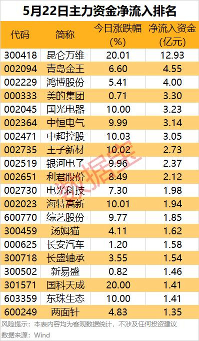此外,还有鸿博股份、美的集团、国光电器、中恒电气、中超控股、王子新材等获主力资金净流入金额居前,其中多股涨停。