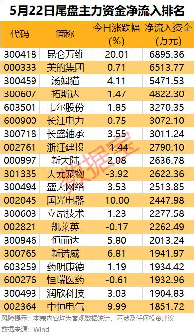 昆仑万维、美的集团尾盘主力资金净流入金额居前,均超6500万元;还有汤姆猫、拓斯达、韦尔股份、长江电力、长盛轴承等尾盘主力资金净流入金额居前。
