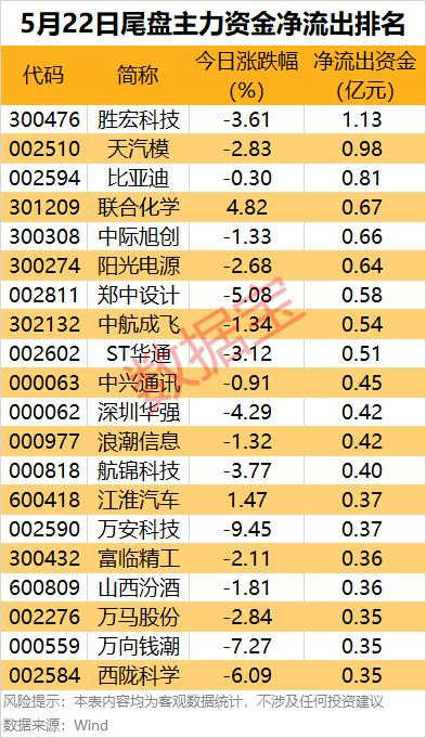 胜宏科技(300476)尾盘主力资金净流出金额居首,为1.13亿元。此外,还有天汽模、比亚迪、联合化学、中际旭创、阳光电源等尾盘净流出金额居前。